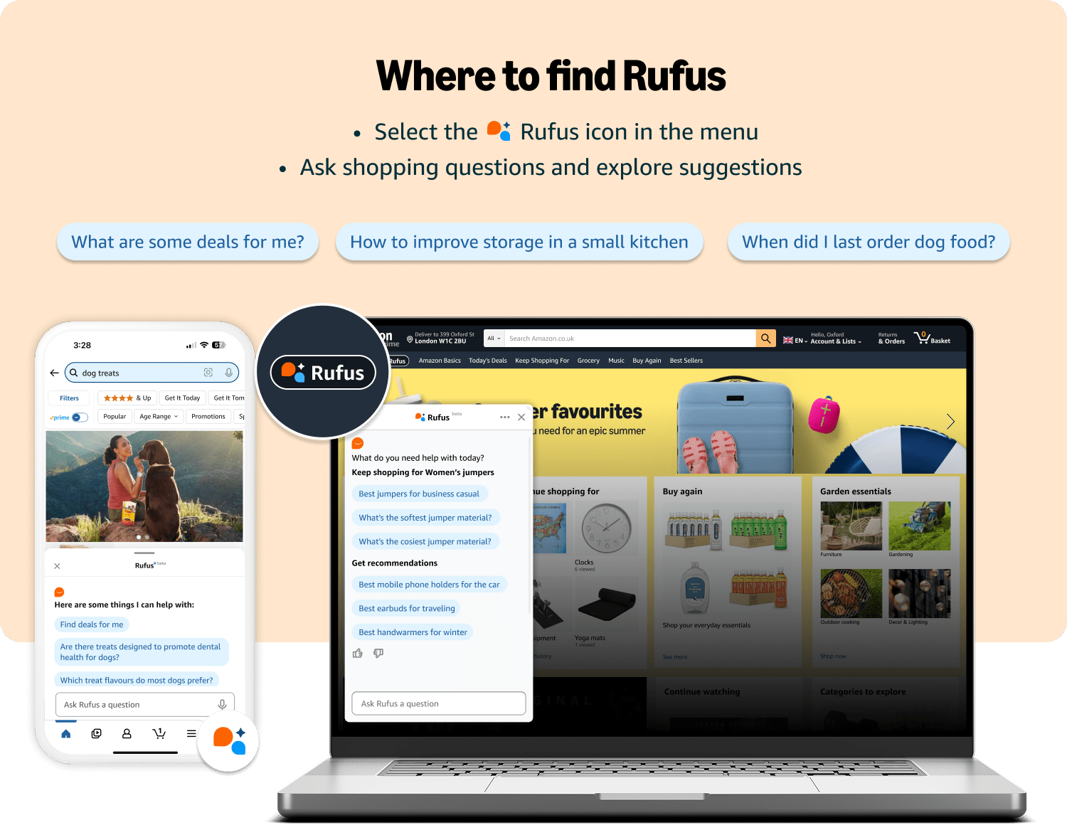Rufus, an AI-powered shopping assistant trained on Amazon's product catalogue and information from across the web, can answer customer questions on shopping needs, products and comparisons, make recommendations based on this, and facilitate product discover in the same Amazon shopping experience that customers use regularly.
