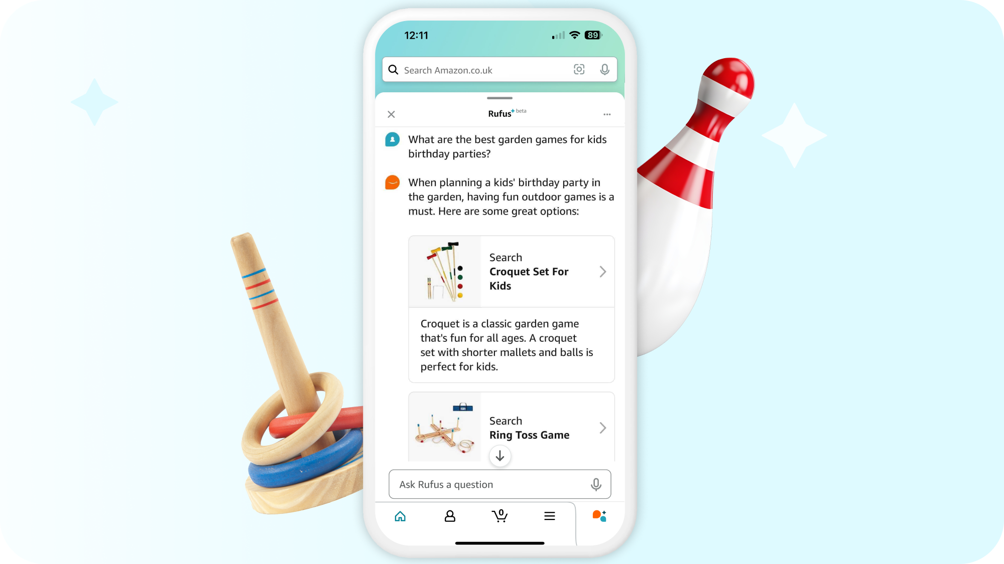 Rufus is now available to all UK customers in the Amazon Shopping app and on desktop. Everyone can get started using it by first making sure their Amazon Shopping app is up-to-date, then tapping the Rufus icon (chat bubbles with sparkle) in the navigation bar at the bottom of their screen. A Rufus chat box will appear and customers can either ask their question, or tap one of the suggested questions to begin a conversation. Customers can now also access Rufus on desktop by clicking on the Rufus icon at the top left of their screen.
