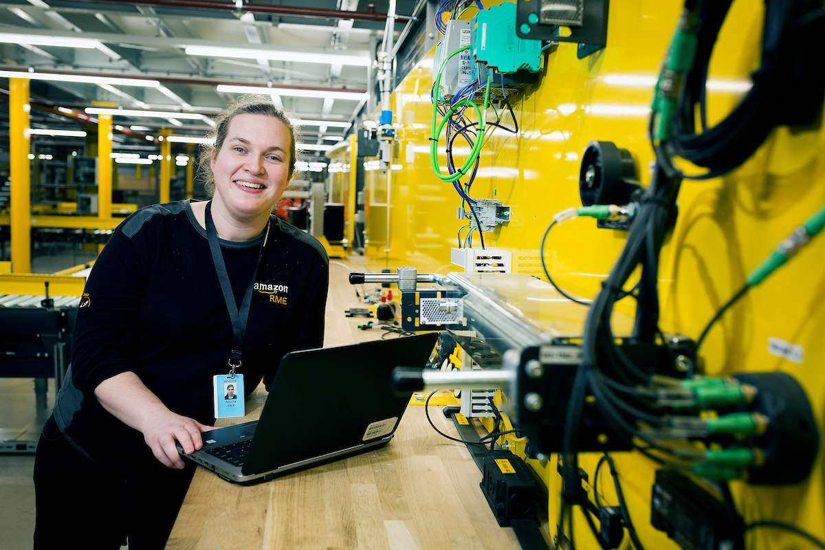 Nicola Elliott is a process automation apprentice working at the Amazon fulfilment centre in Bolton. She started her apprenticeship with Amazon in 2017 and is working towards a qualification to become a process automation engineer after four years of training study with Amazon and Trafford College.