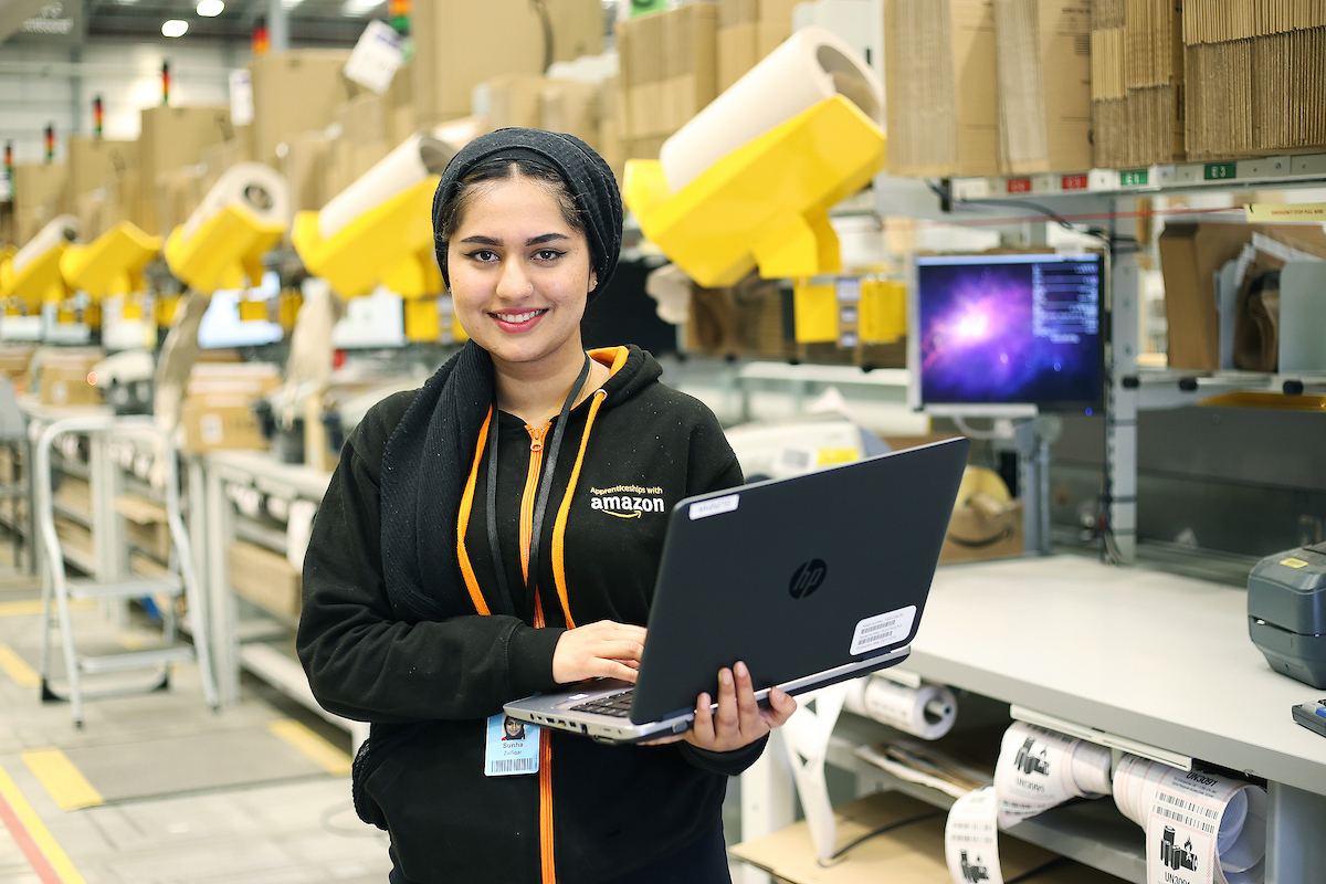 Sunha is one of over 300 apprentices currently working at Amazon in the UK. Amazon has announced it will create a further 1,000 new apprenticeships for new and existing employees in fulfilment centres and development centres across the country. The new apprentices will add to over 27,500 permanent employees currently in the UK, with pay ranging from an entry level starting salary of £9.50/£10.50 an hour, up to £30,000 a year.